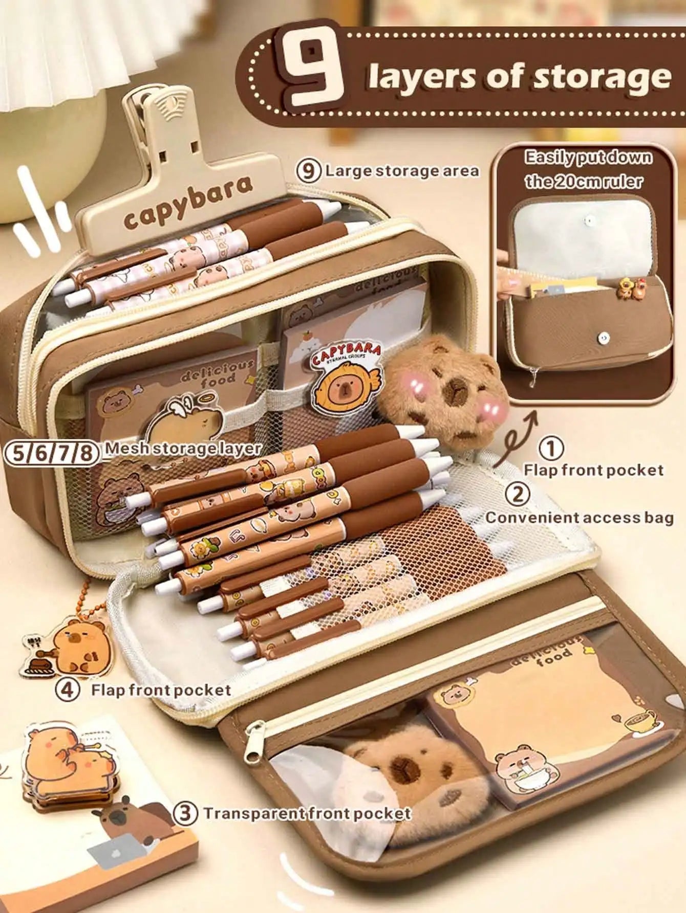 Large Capacity Flip-Cover Capybara Pencil Case – Portable Zippered Stationery Organizer Bag for School & Office Supplies